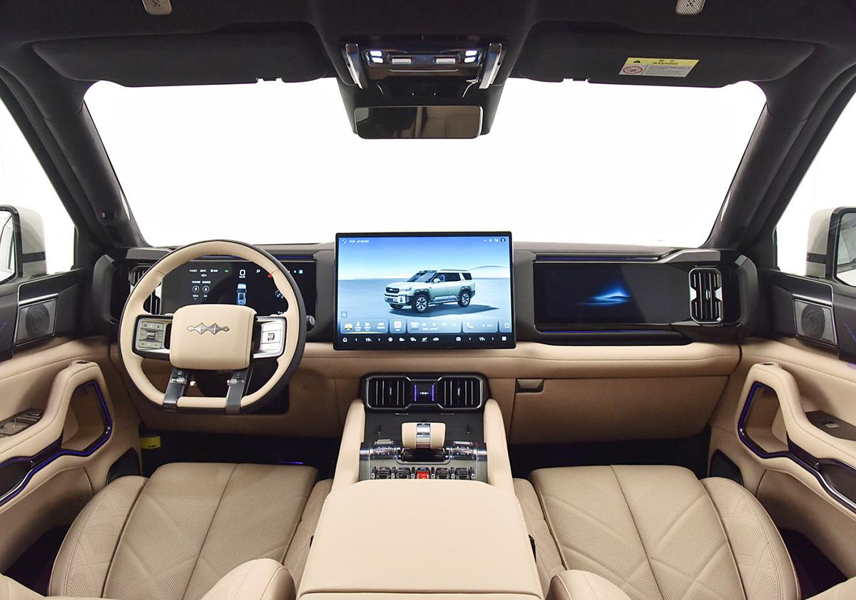 外觀部分,豹8的外觀有著很高的辨識度,整體造型很硬朗。前臉很高大厚重,大燈使用了四邊形的輪廓,黑色的中網(wǎng)上部帶有貫穿式燈帶。前杠造型很硬朗立體,黑色和銀色護板搭配的設計很硬朗。另外在車頂前部帶有三組激光雷達模塊。