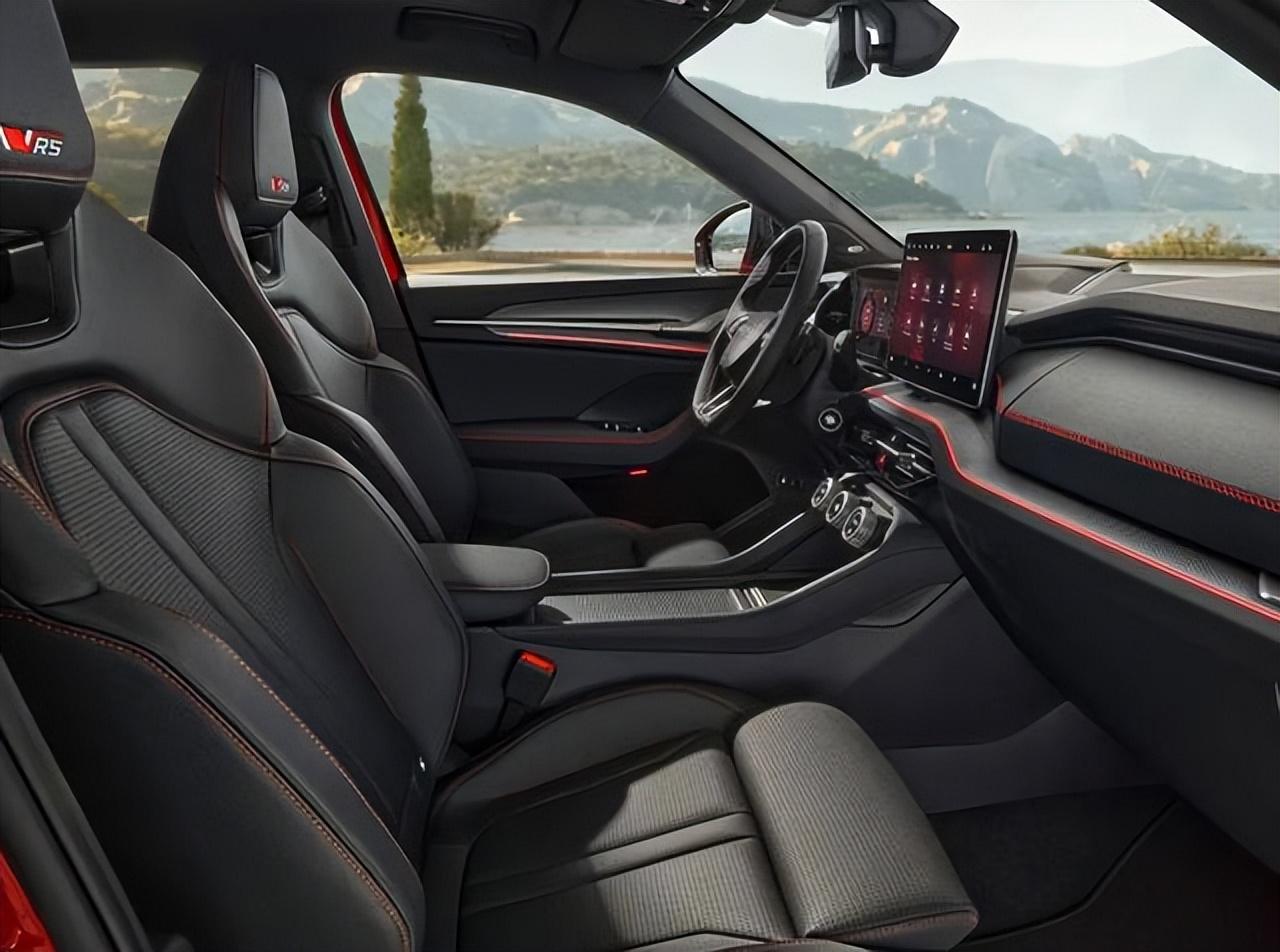 柯迪亞克RS的內飾與外觀保持一致,色調搭配恰好反過來了,車內采用了大面積黑色真皮材質的鋪陳,并運用了大量紅色的雙縫線設計,前排采用了包裹性和支撐性都是頂級的桶裝賽車座椅,加寬了腰、肩、頸部側翼和坐墊側翼,并帶有通風、加熱、按摩功能,支持電動腿托,還使用了四點式安全帶,座椅靠背的后頸位置還采用了鏤空設計,頭枕上帶有vRS手工刺繡圖案,渲染出更加濃郁的運動氛圍。科技感方面,該車配備了10英寸全液晶儀表、13英寸懸浮式中控屏、AR-HUD抬頭顯示系統,三輻式多功能方向盤也采用了碳纖維主體結構,外部是真皮打孔材質包裹,兩側多功能按鍵還帶有振動反饋,更加高級。此外新車還配備了主動式聲浪增強系統,能夠進一步提升運動氛圍。