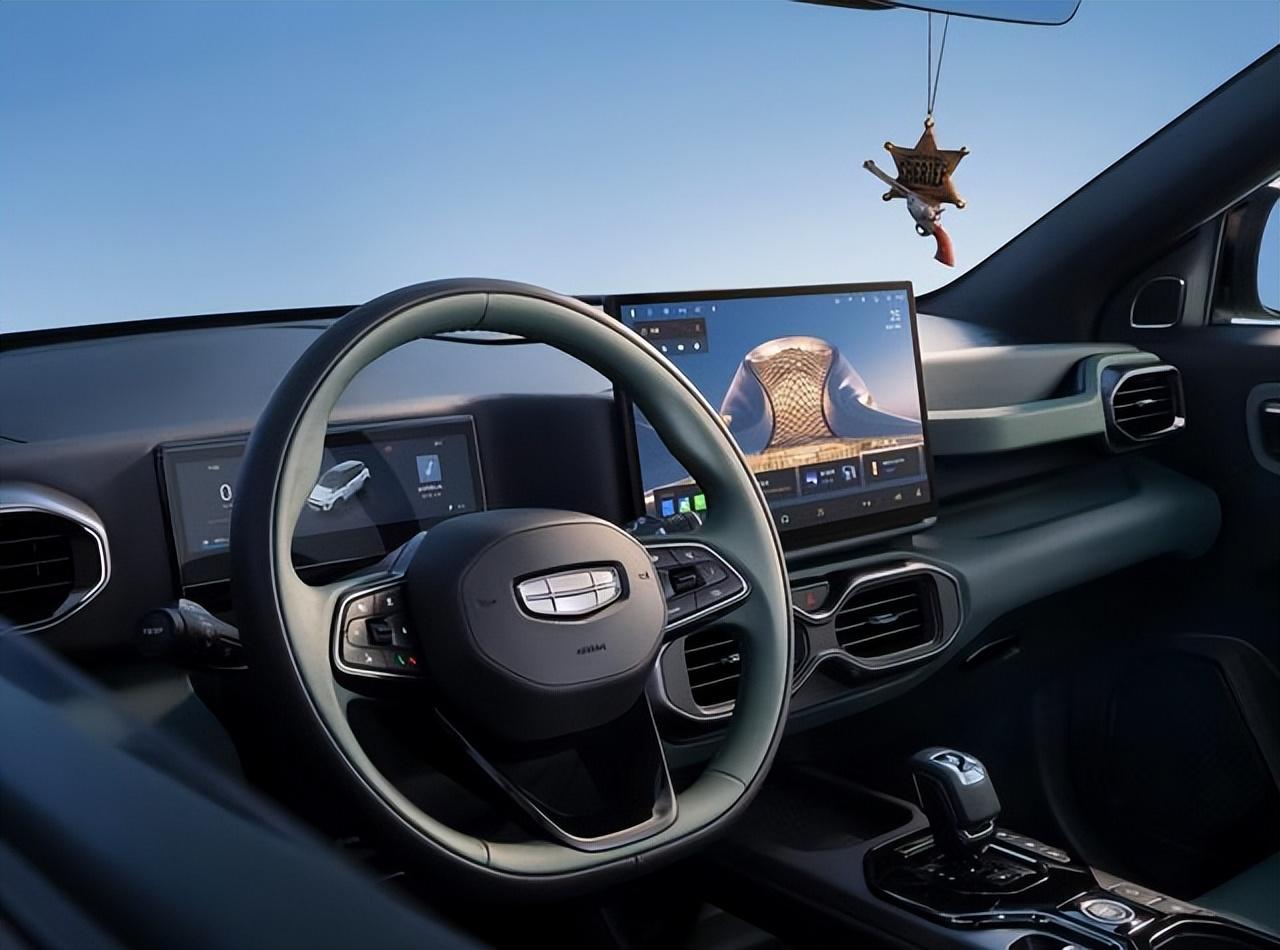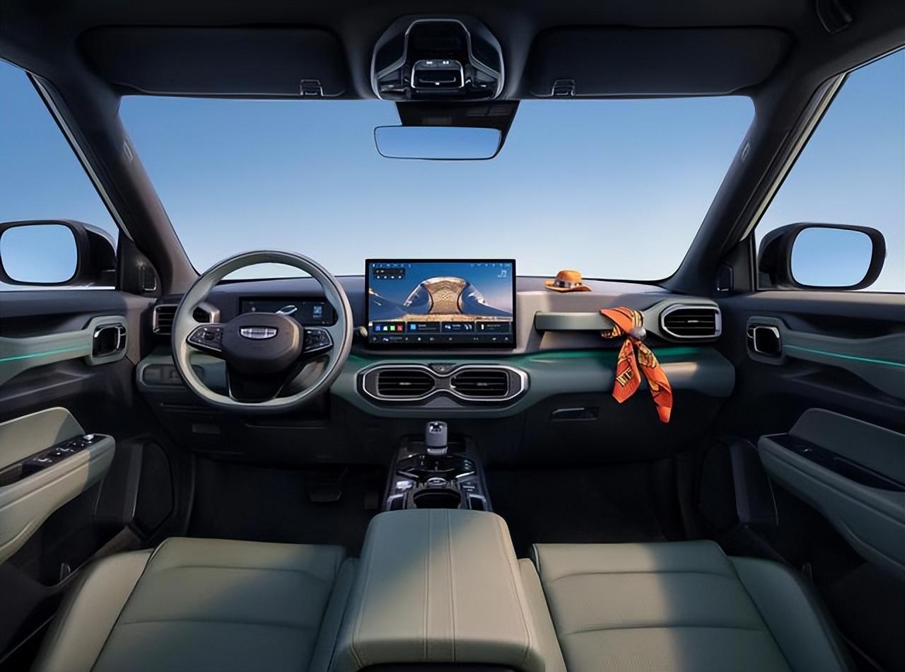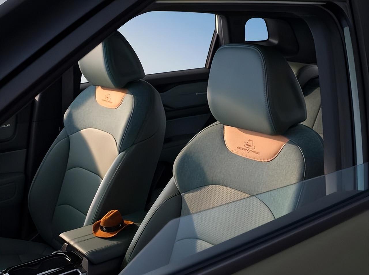 內飾的設計也更為新潮,賽博朋克的設計元素也讓大家眼前一亮。內飾整體風格兼具科技感與越野感,匹配了仙蹤綠和礦野灰兩款主題色。大面積丹寧材質、Alcantara面料,和黑色真皮材質的交替混搭,中控臺和門板四周還有荔枝紋路的黑色硬塑料、銀色金屬門把手、別致的空調出風口。主副駕駛座椅也采用了皮質、牛仔、仿麂皮面料拼搭,座椅靠背還壓印Born Free牛仔浮雕,再配上西部牛仔帽的掛飾,由外而內整體保持自由潮流的牛仔氣息。科技感方面,該車配備了8.8英寸無邊框液晶儀表、14.6英寸極窄邊框的立體中控液晶大屏,內置12nm工藝、8核CPU的E02高性能座艙芯片,響應速度更快。配置方面,像是無鑰匙進入/啟動、主駕6向電動調節、遠程控制、換擋撥片、AQS空氣質量管理系統、智能PM2.5空氣過濾系統、負離子發生器、自動恒溫空調……