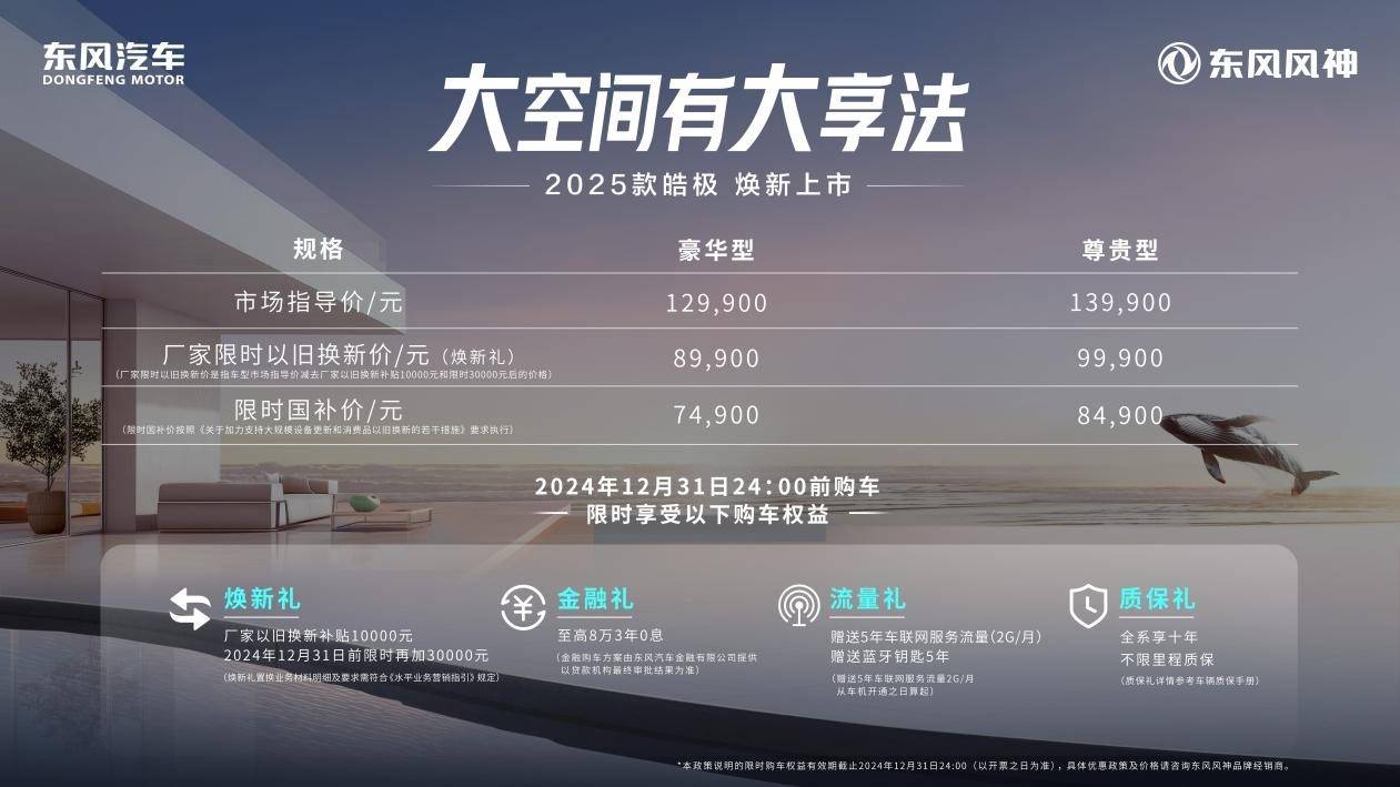 為了讓更多的家庭用戶能夠享受到大空間帶來的美好出行體驗,東風風神在購車權益方面也推出了豐富的優惠政策。2025款皓極豪華型與尊貴型的指導價分別為129900元和139900元,但用戶于2024年12月31日24:00前購車,可享四重購車禮遇: