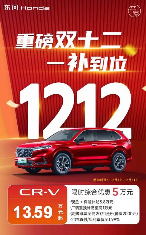 近期,東風本田發布了有關旗下車型的限時優惠購車活動,涉及車型包含了目前市面上在售的本田CR-V、思域、英仕派等車型,并且可疊加享受國家最高2萬元的以舊換新補貼。倘若以本田CR-V為選購目標,那么可享限時綜合優惠5萬元,其中現金+保險補貼3.8萬元,廠端置換補貼至高1萬元,在金融政策上可享受20%首付、年利率低至1.99%,綜合優惠下來,CR-V的門檻價格低至13.59萬元起(此價格優惠行情僅供參考,詳情建議咨詢當地經銷商)。