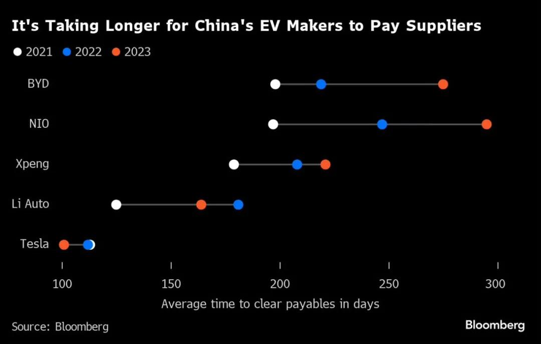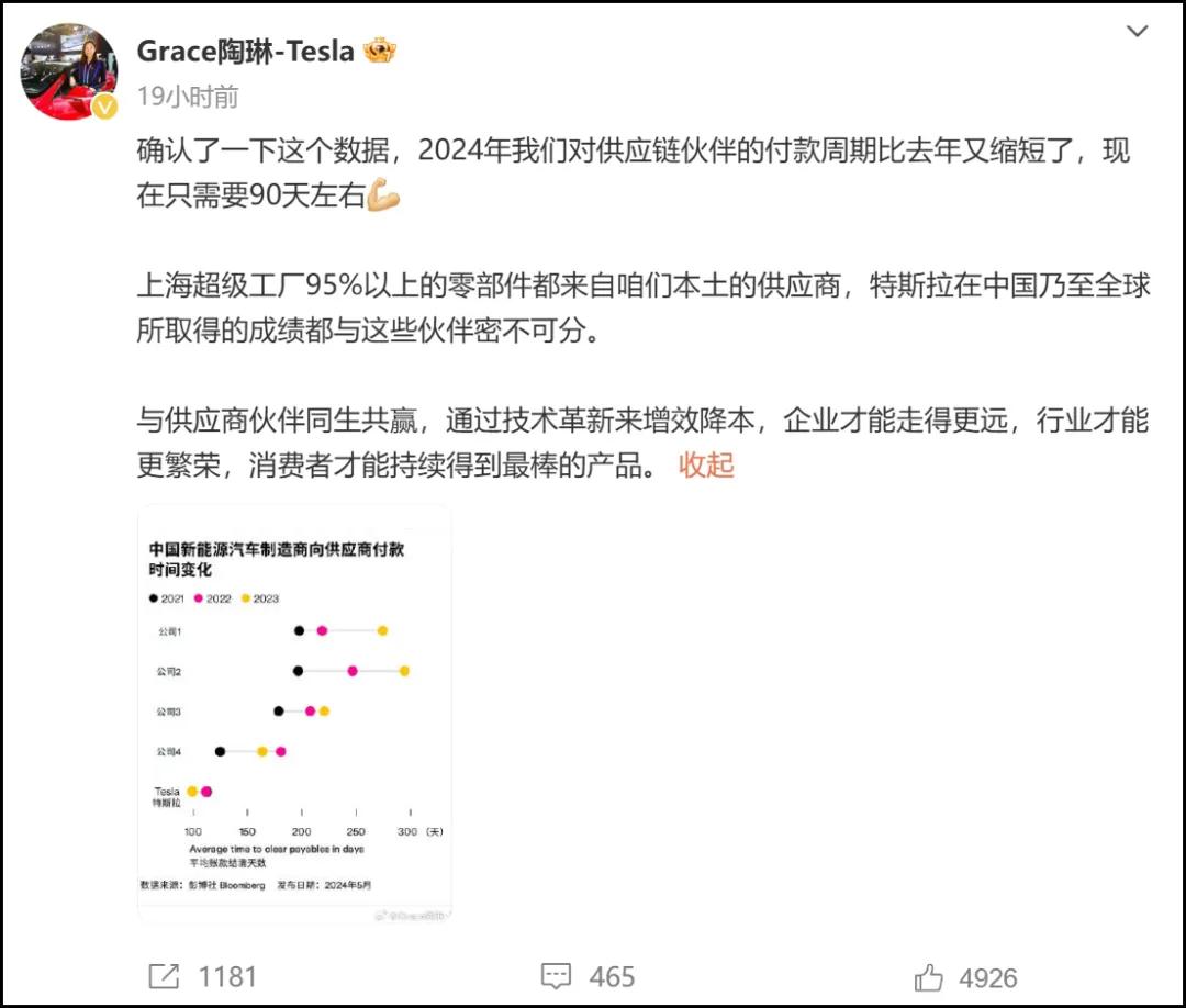 不知道是不是受到比亞迪供應商郵件風波的影響,最近車企與供應商之間的微妙關系開始被大家關注了起來。特斯拉的高管陶琳就在個人社交賬號上發布內容表示,2024年特斯拉對供應鏈伙伴的付款周期相比2023年進一步縮短,現在只要90天左右,并曬出了一張由彭博社統計的圖表。