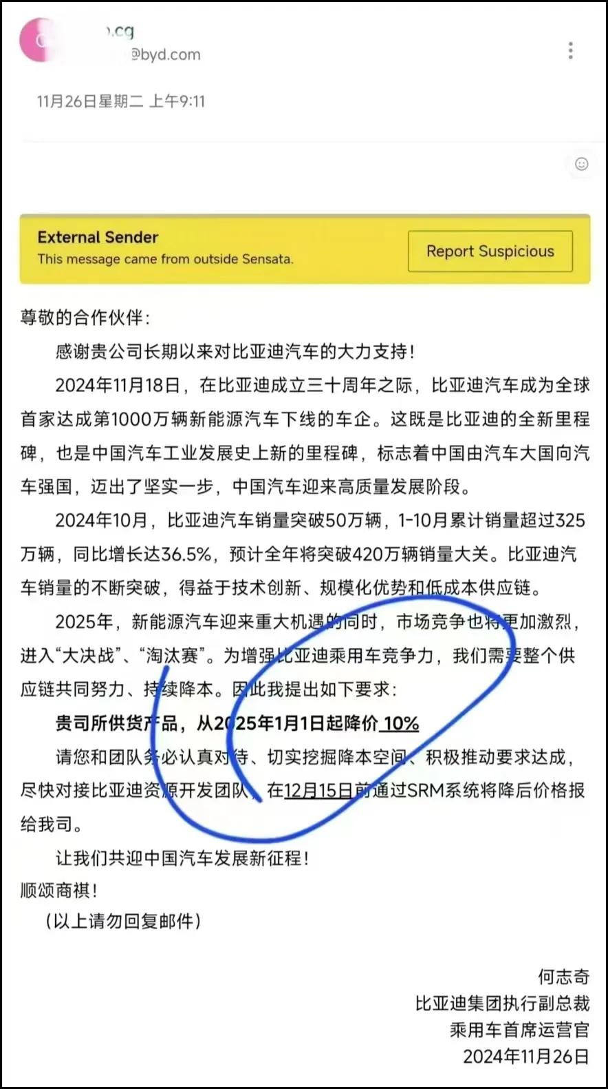 本周一張疑似某供應商內部郵件截圖曝光,郵件顯示,該供應商被比亞迪要求,從2025年1月1日起降價10%,以應對市場競爭。郵件曝光后,這件事迅速引發了爭議,網友也都給出了不同的觀點。