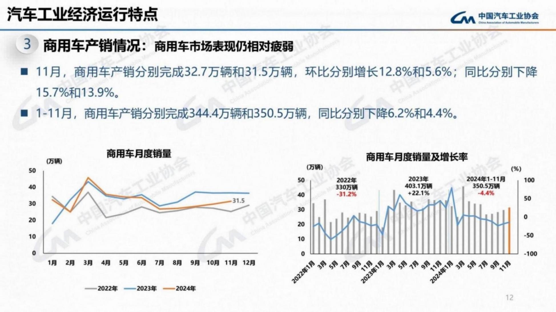 2024年12月11日,中國汽車工業協會對外發布了商用車2024年11月以及2024年1-11月產銷最新數據。其中,2024年11月,商用車產銷分別完成32.7萬輛和31.5萬輛。而2024年1-11月,商用車產銷分別完成344.4萬輛和350.5萬輛。