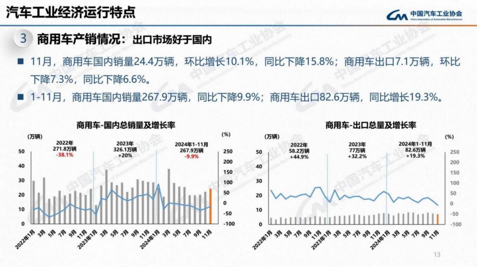 而2024年1-11月,商用車國內銷量267.9萬輛,同比下降9.9%;商用車出口82.6萬輛,同比增長19.3%。