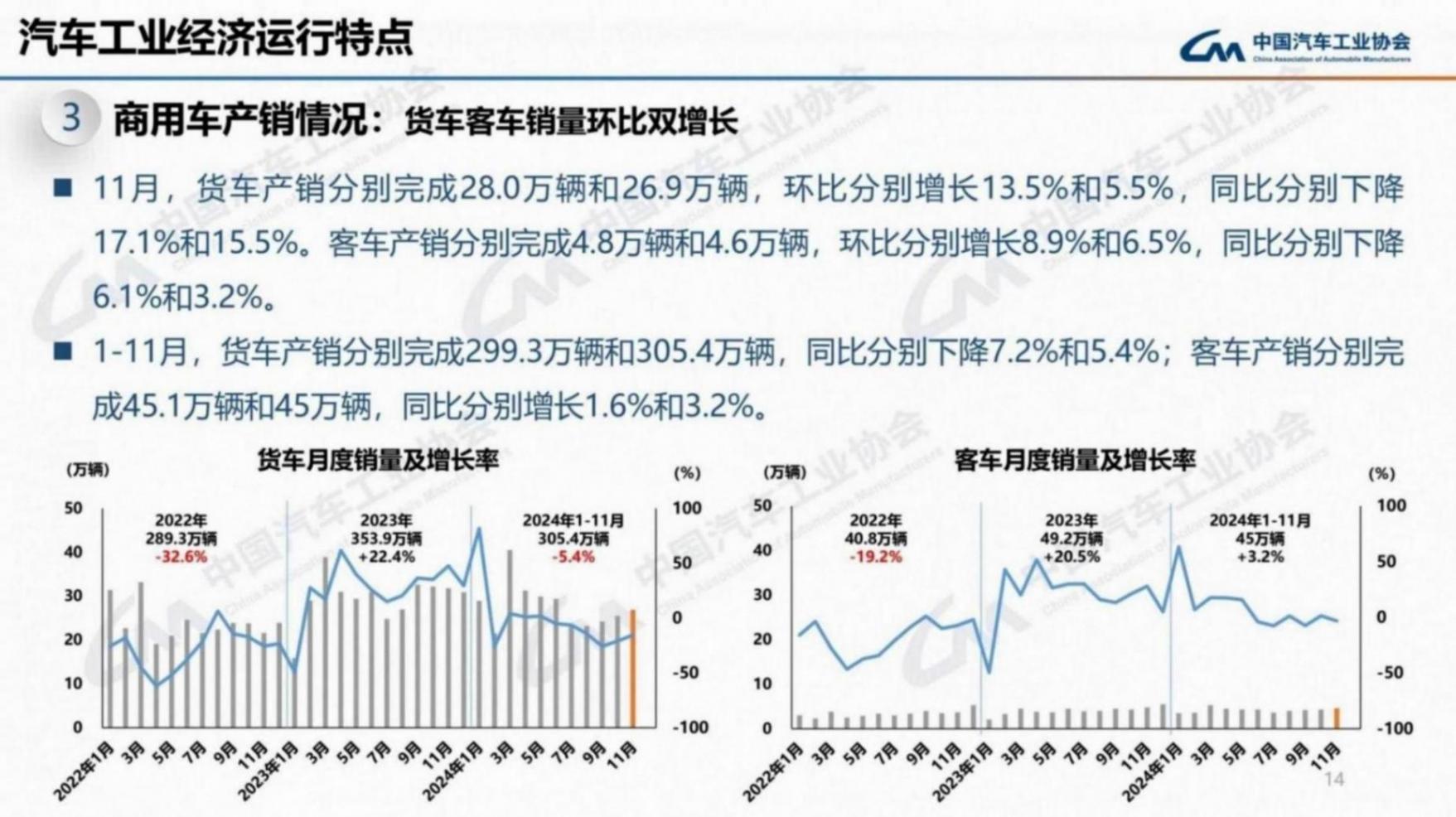 根據中國汽車工業協會發布數據顯示,2024年11月,商用車產銷分別完成32.7萬輛和31.5萬輛,環比分別增長12.8%和5.6%,同比分別下降15.7%和13.9%。在商用車主要品種中,與上月相比,客車和貨車產銷均呈不同程度增長;與上年同期相比,客車產銷小幅下降,貨車產銷兩位數下降。