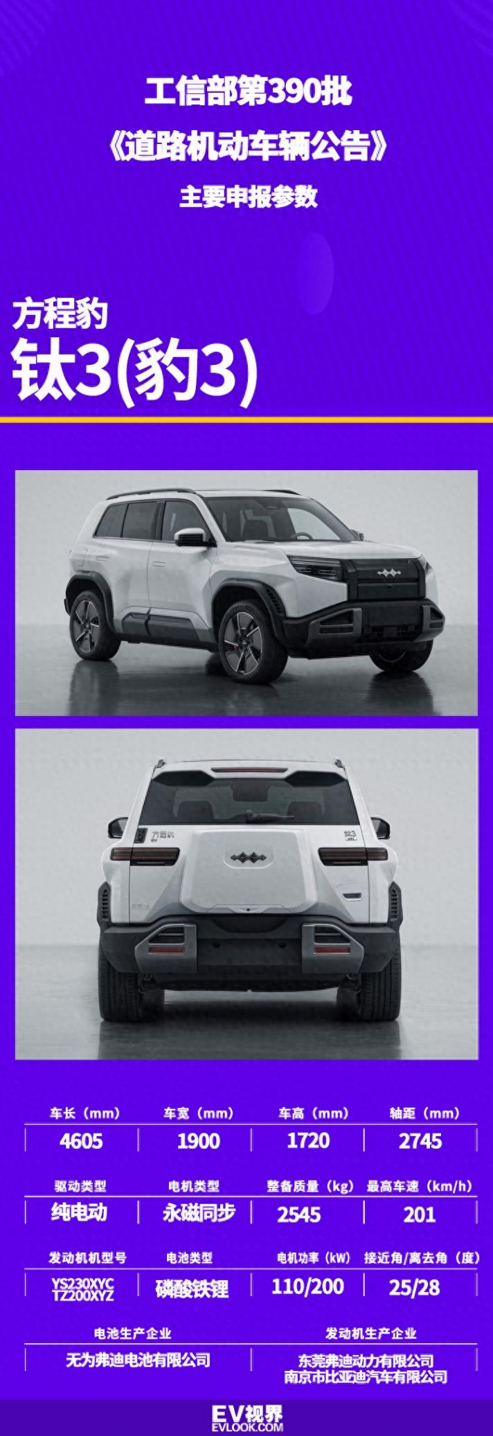 日前,工信部公示第390批《道路機動車輛生產(chǎn)企業(yè)及產(chǎn)品公告》,其中方程豹豹3在列。與此前申報版本不同的是,該車尾標更換為鈦3,不排除未來會進行更名的可能。結(jié)合此前消息,新車的預(yù)計售價為22萬起。