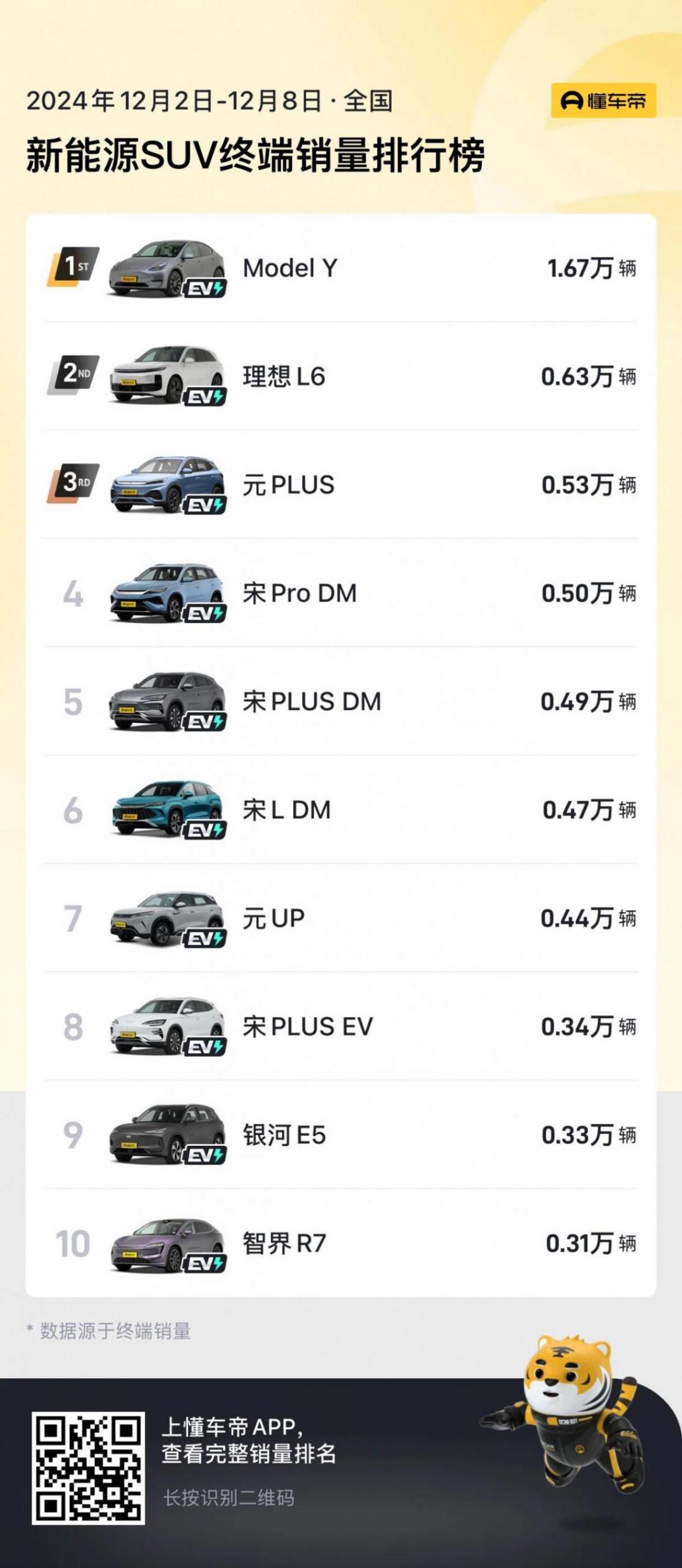 接著是SUV榜單,特斯拉Model Y單周銷量已經來到了1.67萬臺,可以說是遙遙領先,排名第一,理想L6交付穩定,單周0.63萬臺,又回到了高點,排名第二。接著就是比亞迪的雙元和四宋車型,也是榜單上的老熟人。同時榜單上也迎來了一位新選手——智界R7,上一周交付了0.31萬臺,把同門師兄問界M9擠出了榜單。