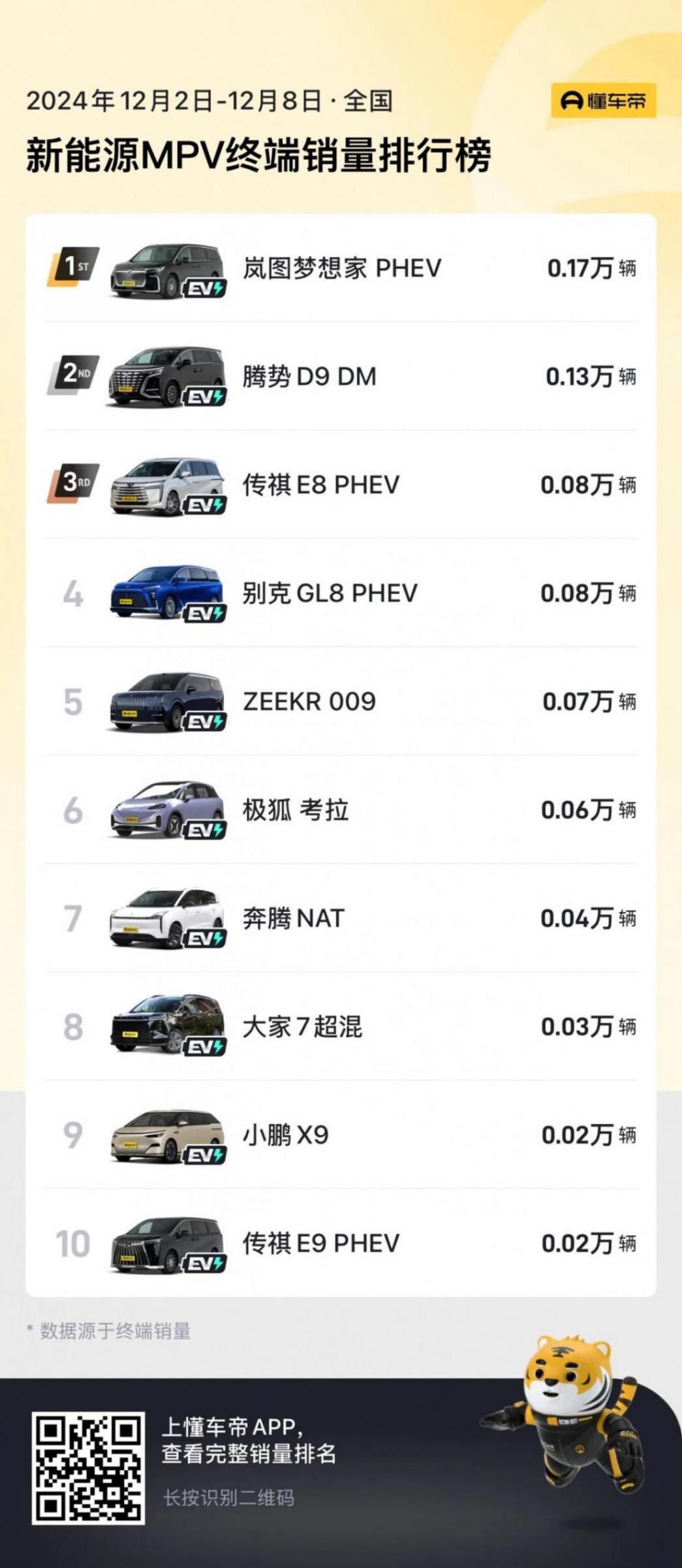 最后是MPV,嵐圖夢想家PHEV拿下了周銷冠,單周0.17萬臺,比第二名騰勢D9 DM-i的0.13萬臺,多賣了約400臺,而且上一周的榜單上也就這兩款車型周銷量超過了1000臺,不過榜單上也有新人的,那就是來自上汽大通的大家7超混,單周銷量0.03萬臺,排名第8。