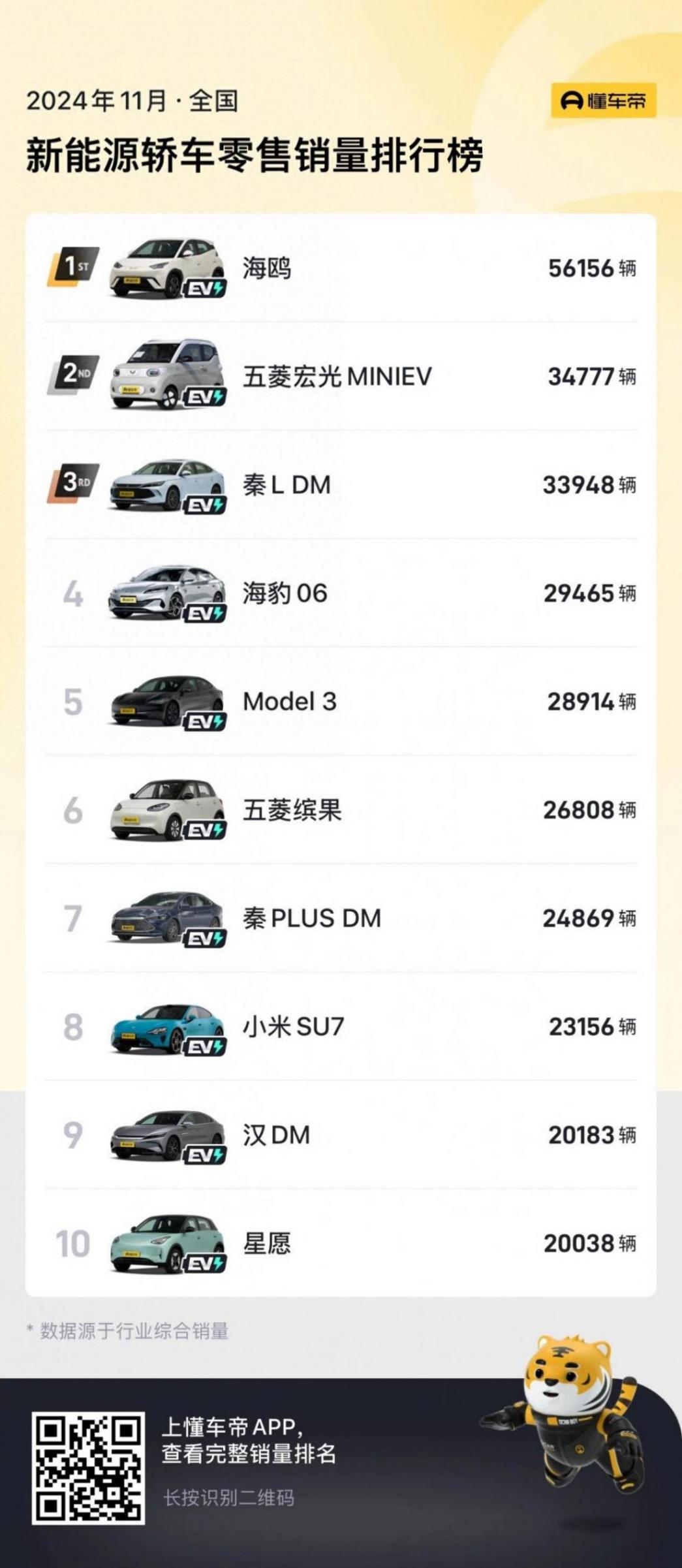 先來看總榜部分,11月的能上榜單的選手都有著單月20000+的實力,可想而知市場是有多卷。而比亞迪在新能源轎車領域依舊占據了半壁江山,其中海鷗的單月銷量已經來到了56156輛,本有大有沖擊月銷6萬臺的趨勢,位居榜單第一。第二名則是五菱宏光MINI EV,銷量較10月份有輕微上漲,而秦L DM-i和海豹06則因為銷量有一定的收縮,所以排在了五菱代步小車的后面。另外,秦PLUS DM-i和漢DM依舊是穩穩的上榜,本身的銷量變化,不是太大。