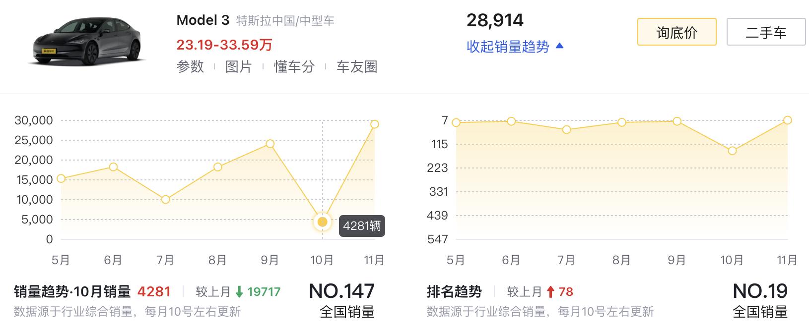 11月銷量變化比較大的,就是特斯拉Model 3了,在經過一個月的集中交付之后,也從10月份的4281輛,飆升到了28914輛,翻了約7倍,排名也順勢來到了第5名。按照慣例,預計12月份,Model 3的交付量會有一定的下滑。