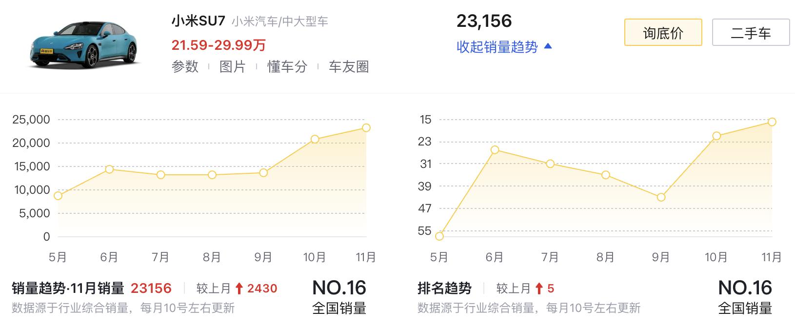小米SU7在上個月的交付量是23156輛,并且小米是在11月中下旬就完成了全年10萬臺的銷售目標,12月份要沖擊3萬臺,那么全年銷量應該就是在14萬臺左右了。