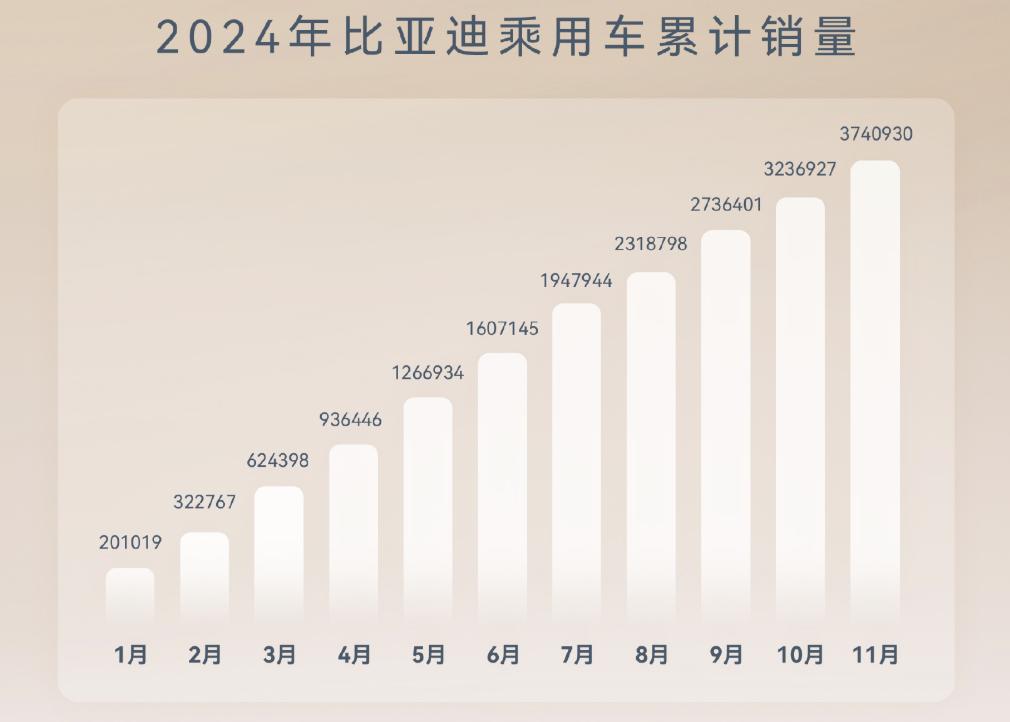 此外,年初的消息顯示,比亞迪的2024年預期銷量為360萬輛,但是到了今年11月,比亞迪的銷量已經超過了374萬輛,如果12月份,比亞迪依舊能保持月銷量50萬+,那么今年比亞迪就能以年銷量420多萬臺的成績收官,實現年銷量同比超40%的增長速率。