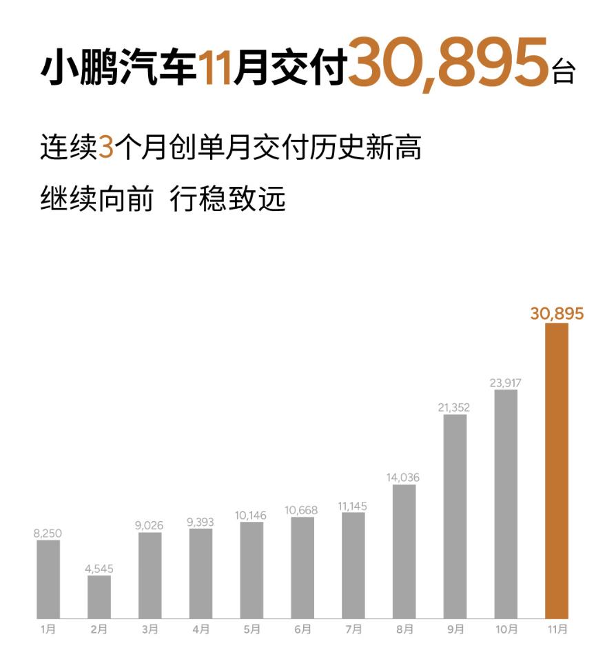 小鵬汽車11月銷量破3萬!官方數據顯示,小鵬11月銷量為30895輛,同比增長54%,環比增長29%。這也是小鵬首次單月銷量超過3萬臺,并且連續3個月創下新高。其中,小鵬MONA M03連續3個月銷量破萬,而小鵬P7+發布23天,累計交付量超過7000臺