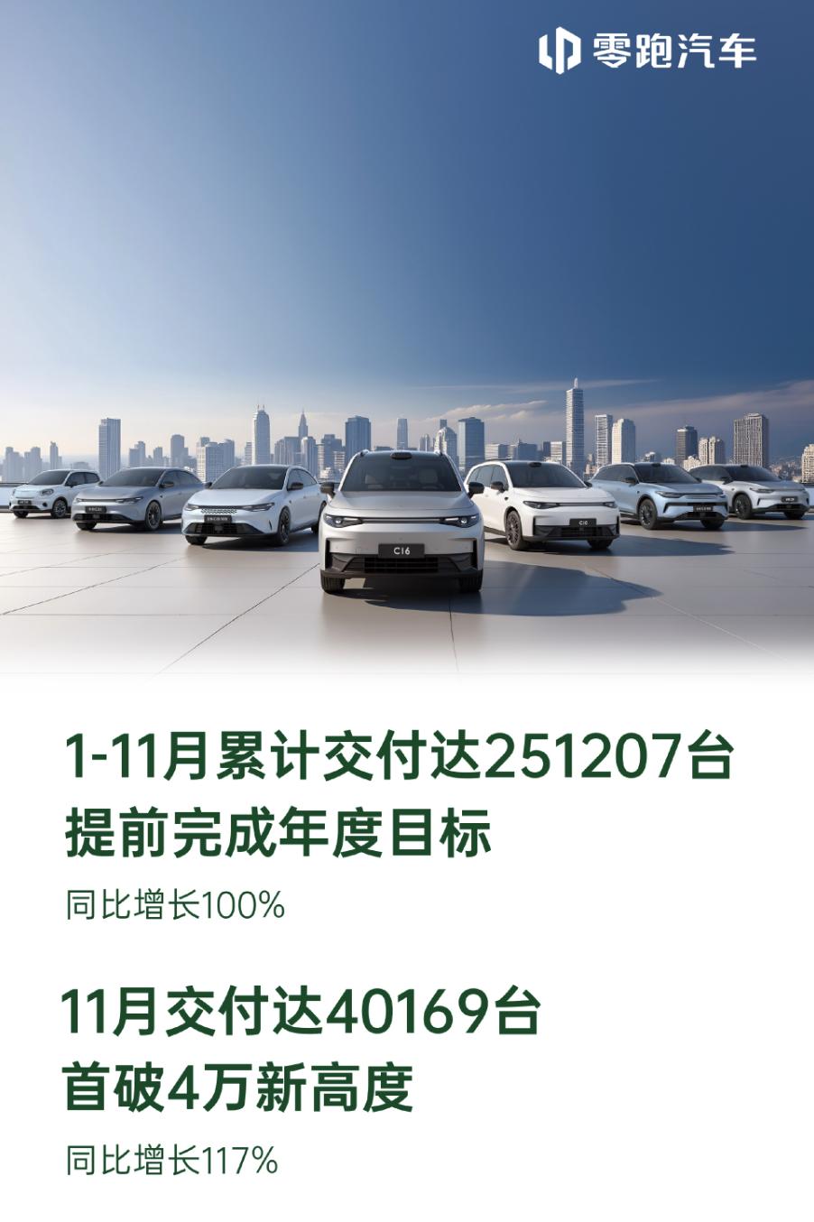 零跑11月銷量超4萬!官方數據顯示,零跑汽車11月的交付量為40169臺,同比增長117%,首次突破4萬臺,創下新的月銷量成績。2024年1-11月,零跑汽車累計交付達251207臺,同比增長100%,并且提前完成年度目標,從銷量數據來看,零跑已經是一線的水平了,老板們覺得呢?