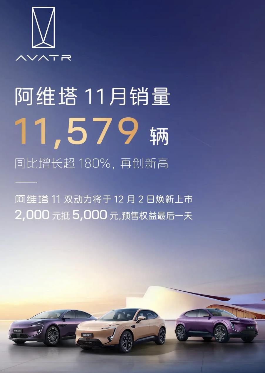 阿維塔11月銷量為11579輛,同比增長超過了180%,連續兩個月銷量破萬,目前阿維塔的主銷車型是阿維塔07,指導價21.99萬元起,然后是阿維塔12,由于訂單的擠壓,阿維塔依舊需要提升產能來加快交付進度。有意思的是,銷量起來的阿維塔月初發海報也是相當積極,10月是第一個發的,11月又是第一個,官方甚至安排了一個早上7點的定時發送。