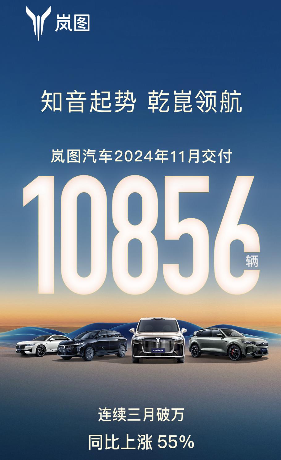 嵐圖汽車11月銷量10856輛,同比上漲55%,也是嵐圖首次實現連續三個月銷量破萬。目前,嵐圖汽車的主銷車型為嵐圖夢想家,10月是新能源MPV的銷冠,在售車型還有追光PHEV、嵐圖FREE、知音等車型,涵蓋了轎車、SUV和MPV多個細分市場。