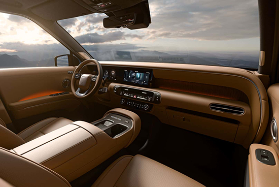 新車側(cè)面運(yùn)用了更多的平直線條,搭配其中大型SUV的尺寸,整體看上去極富力量感。具體尺寸方面,車長為5050mm,軸距達(dá)到2970mm,軸距相較現(xiàn)款車型增加了70mm。車尾的線條相比前臉和側(cè)面要圓潤了不少,上方還配備大尺寸擾流板,中間則是品牌LOGO和帕里斯帝的英文名稱。