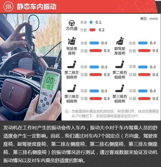 在靜態車內振動測試環節,怠速狀態,方向盤處的振動數值為0.1mm/s,全車座椅的振動數值為0.4mm/s。負載狀態下,所有固定點的振動數值均出現小幅升高,但對實際體感影響不大。