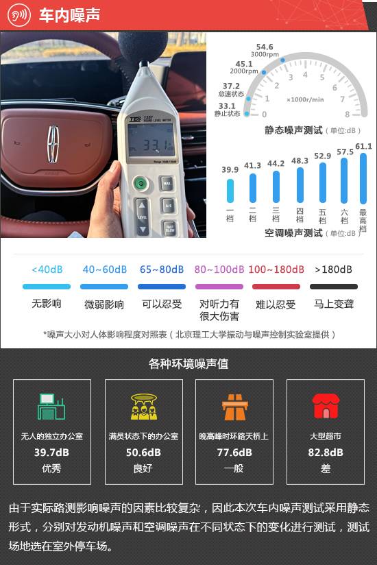 在靜態噪聲測試環節,評測車在靜止狀態下車內實測噪聲值為33.1dB。隨著發動機啟動,傳入車內的噪聲值呈現出逐漸增大的趨勢,從測試數據來看,發動機在怠速、2000轉和3000轉時,傳入車內的噪聲值分別為37.2dB、45.1dB和54.6dB,整體表現屬于同級別車型平均水平。
