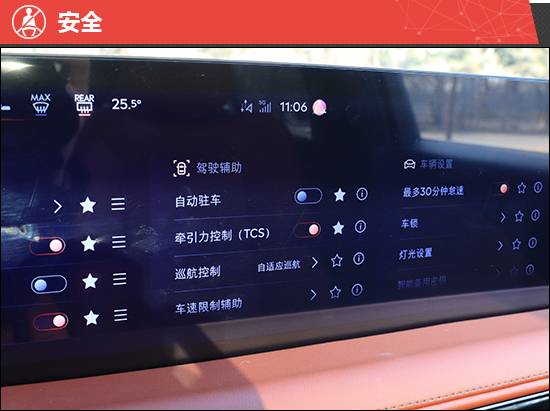 評測車搭載L2級輔助駕駛系統,按下方向盤左側帶有儀表的按鍵即可開啟。全速自適應巡航跟車過程中響應速度適中,未出現急加速或急減速情況。此外,跟車距離支持四檔調節,當調整到最近檔位時與前車間距較遠,容易被其他社會車輛加塞。