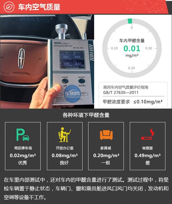 在車內空氣質量測試環節,將車輛放置在車輛較少的內部地面停車場中,實測車內甲醛含量為0.01mg/m3,符合2012年3月1日起實施的,由原環保部和國家質量監督檢驗檢疫總局聯合發布的《乘用車內空氣質量評價指南》(中華人民共和國國家標準GB/T 27630-2011)中的相關標準。