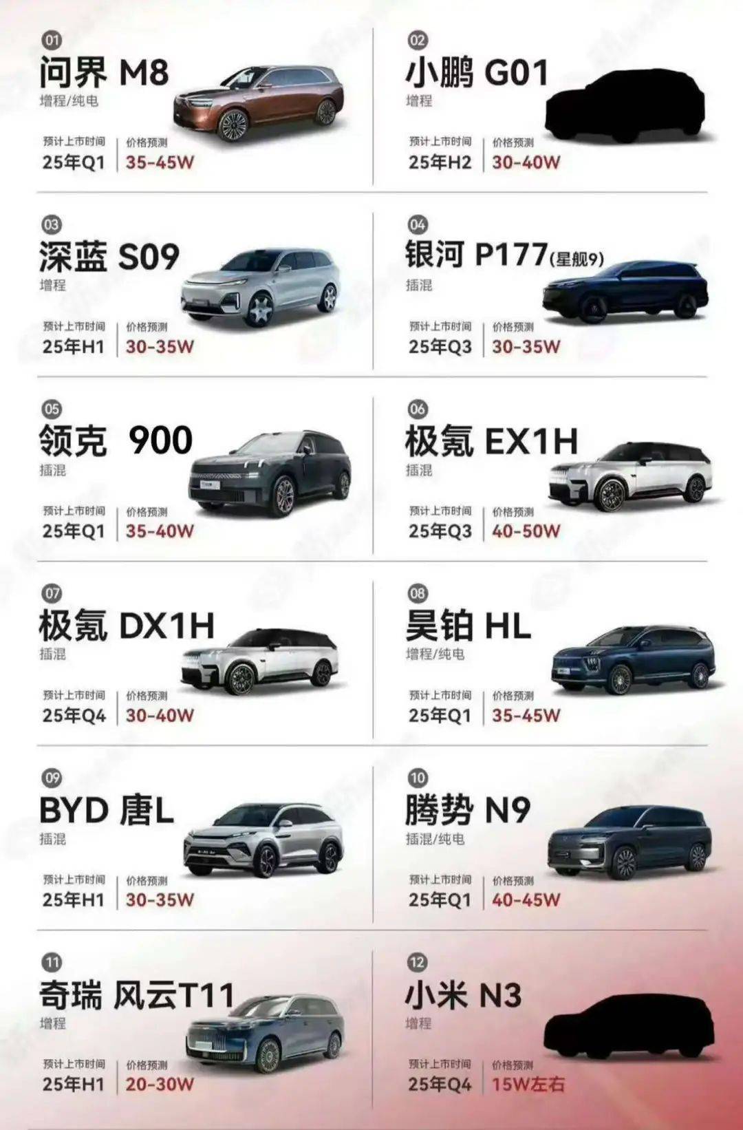 除了剛剛發(fā)布的領(lǐng)克900外,在未來的一年里,像領(lǐng)克900這等尺寸的大車還有十幾臺。包括25年上半年上市的問界M8、深藍(lán)S09、比亞迪 唐L、騰勢N9、昊鉑HL、奇瑞風(fēng)云T11,以及銀河星艦 9、小鵬G01、極氪EX1H、小米N3(亮相)……