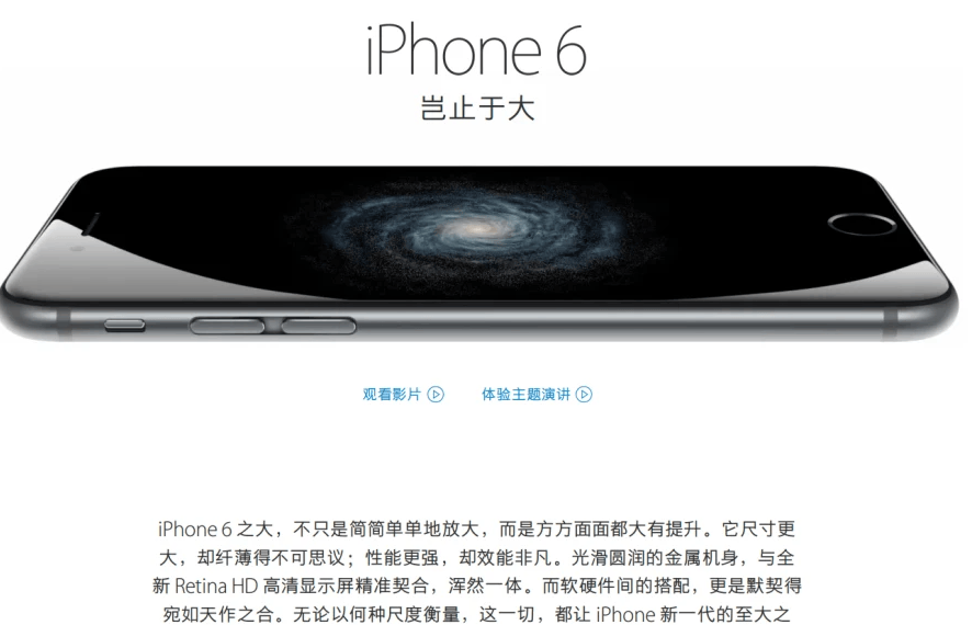 早在十年前2014年9月份,蘋果在發(fā)布iPhone6和iPhone6 plus的宣傳語就用上了“Bigger than bigger”,大陸官網(wǎng)譯為“比更大還更大”,港臺官網(wǎng)則譯作“豈止于大”。從這一點(diǎn)或許就早早地寫清楚了中國用戶的消費(fèi)習(xí)慣。