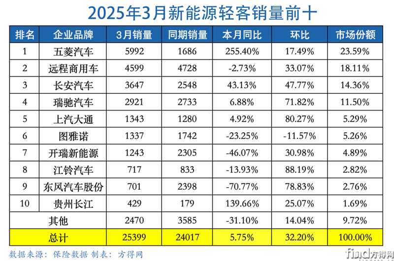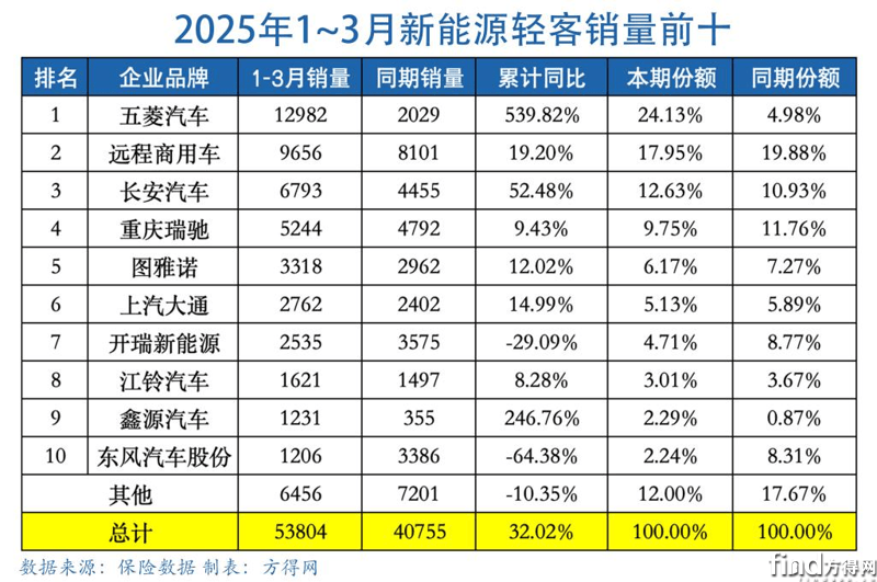 新能源輕客2025年3月銷量前十品牌依次為五菱汽車、遠程商用車、長安汽車(包括長安凱程、長安跨越)、瑞馳汽車、上汽大通、圖雅諾、開瑞新能源、江鈴汽車、東風汽車股份和貴州長江。