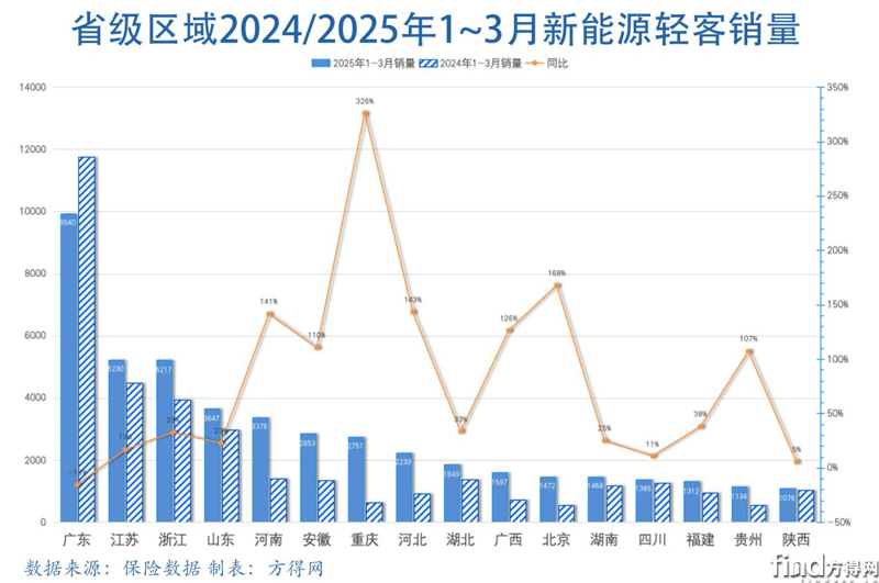 2025年1-3月,廣東新能源輕客銷量近1萬輛,累計超5000輛的江蘇、浙江排名二三位,排名第四第五的山東河南累銷超3000輛。