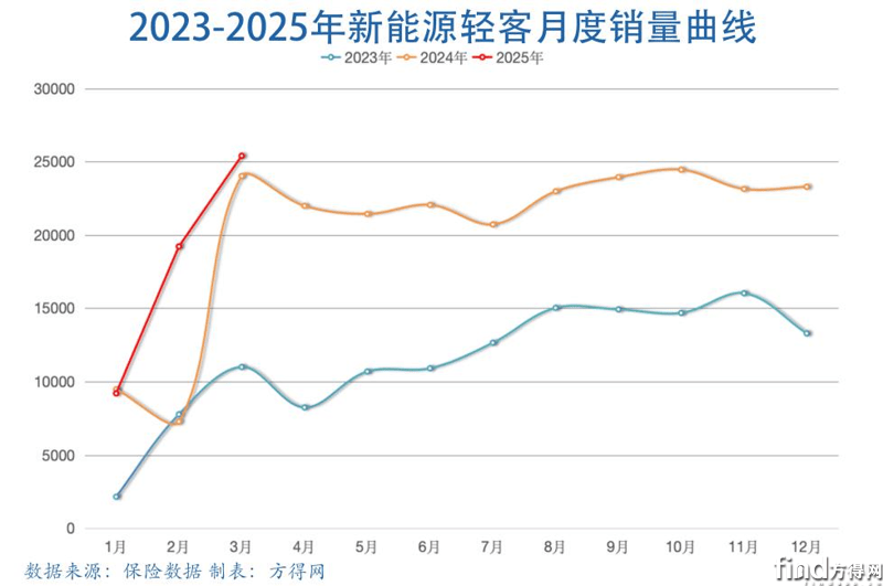 新能源輕客2025年一季度銷售呈現直線上升態勢,3月首次突破2.5萬輛大關,全年市場前景看好。