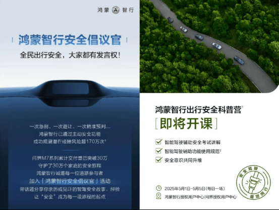 而華為這邊也在前段時間推出了“鴻蒙智行安全倡議官”活動,鼓勵用戶帶話題發帖分享安全故事和經驗,發出自己的安全宣言,在正確引導輿論的同時宣傳了自身車型的主動安全性能。并且五一期間鴻蒙智行每天還將在用戶中心舉辦“鴻蒙智行出行安全科普營”課程,囊括了智能駕駛輔助安全考試講解、功能使用規范以及安全意識等相關知識。
