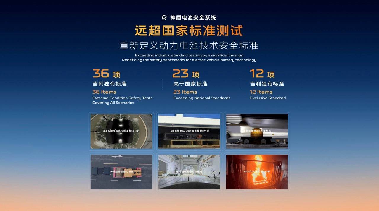 神盾電池安全系統測試標準遠超 “新國標”,電池需歷經 36 項全場景極限工況安全測試,其中 23 項標準超 “新國標”,還有 12 項吉利獨有的企業標準測試,如電芯針刺、海水浸泡等。