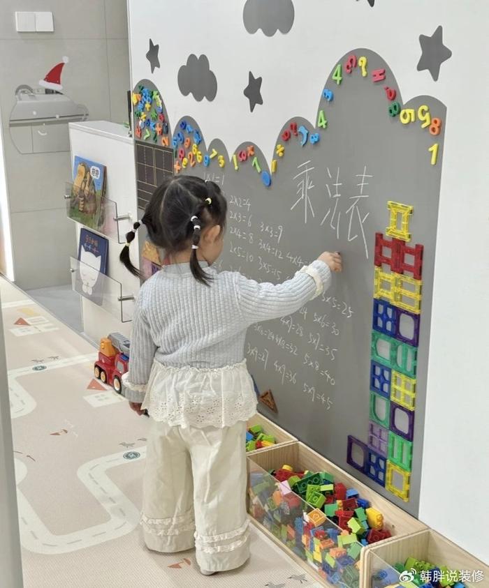 很喜歡磁吸黑板墻的設計,不僅可以在上面玩拼圖,還可以盡情書寫。有專屬的寫畫空間,不會惦記其他大白墻,也算是一種墻面保護措施。