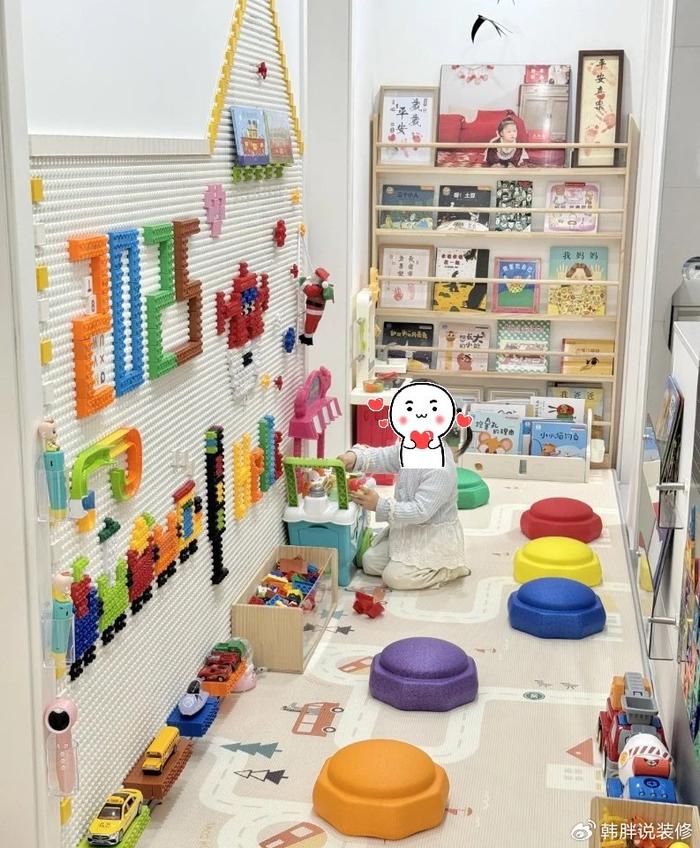除了地面上鋪滿了爬爬墊之外,墻壁上也貼上了積木板、磁吸黑板墻,還安裝了收納繪本的小書架。不僅能夠滿足玩耍的需求,還有開發智力的作用。
