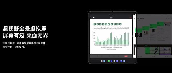 資料顯示,超視野全景虛擬屏是Find N3首發的折疊屏內屏多應用交互方式,和傳統的、以屏幕物理尺寸為邊界的交互設計不同,超視野全景虛擬屏就像它名字一樣,讓不同尺寸、不同大小的應用窗口,超越屏幕視野限制、自由排列。