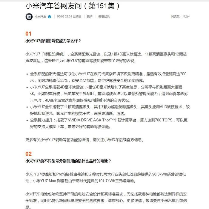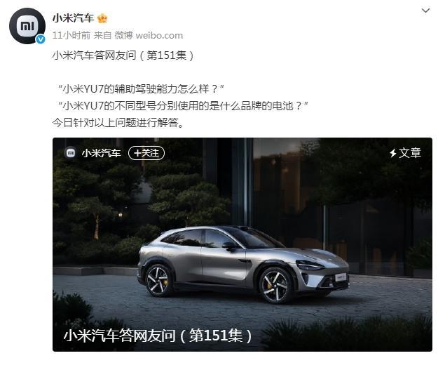 6月3日,小米汽車官方微博發(fā)文答網(wǎng)友問,其中提到了,小米YU7的不同型號(hào)分別使用的是什么品牌的電池?小米YU7的輔助駕駛能力怎么樣?