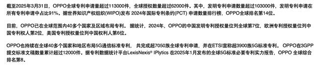 OPPO 深知技術是品牌立足市場的根本,因此在研發投入上從不吝嗇。多年來持續不斷的投入,讓 OPPO 積累了大量核心技術。截至 2025 年 3 月,〇PPO全球專利申請量超過113000件,全球授權數量超過62000件。其中,發明專利申請數量超過103000件,發明專利申請在所有專利申請中占比91%。據世界知識產權組織(WIPO)發布2024年國際專利條約(PCT)申請數量排行榜,OPPO全球排名第14位!