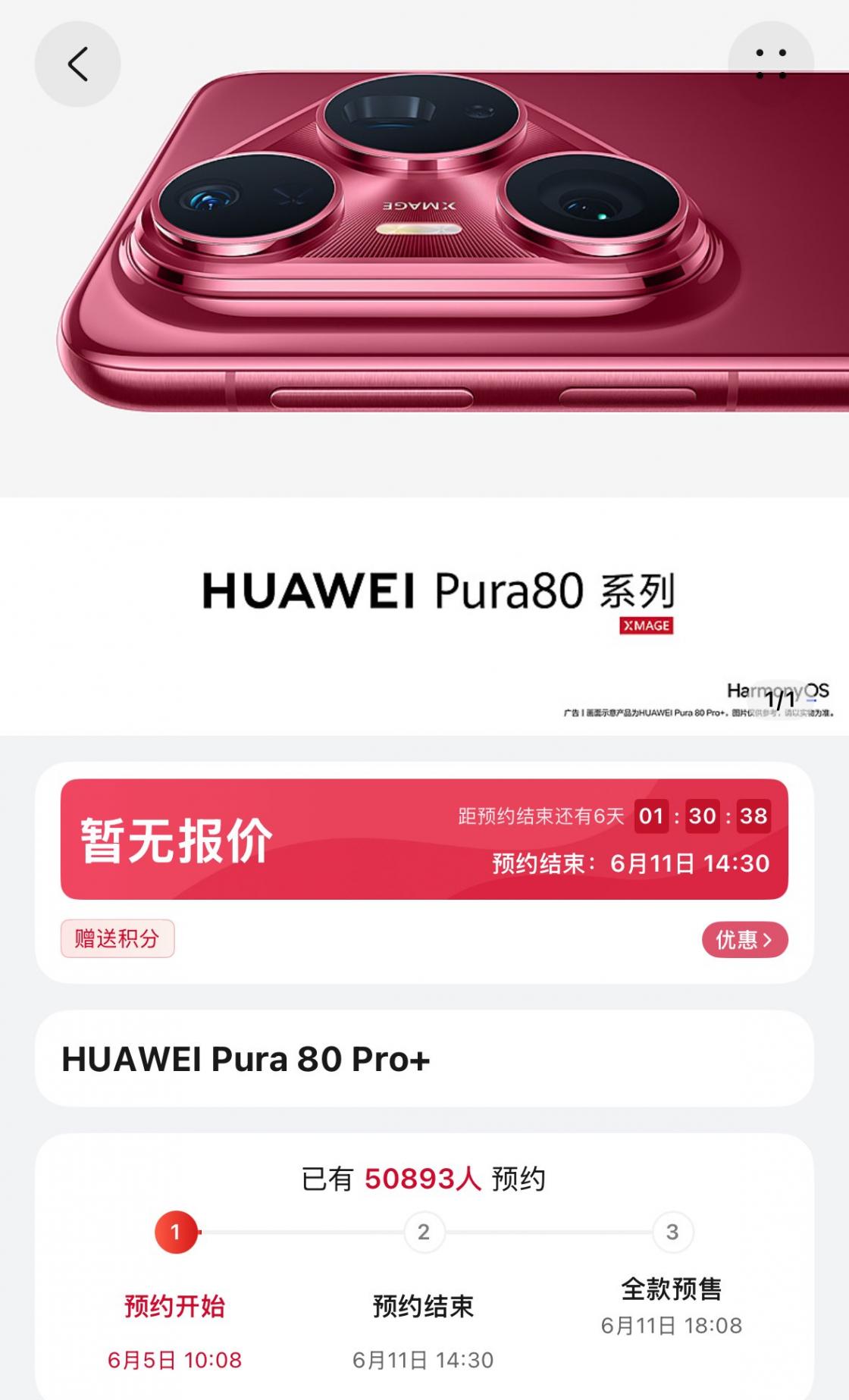 6月5日午間,華為商城數據顯示,華為Pura 80系列預約購買人數已超5萬。華為Pura 80 Pro、華為Pura 80 Pro+于6月5日10時08分開啟預約,將于6月11日開啟預售。