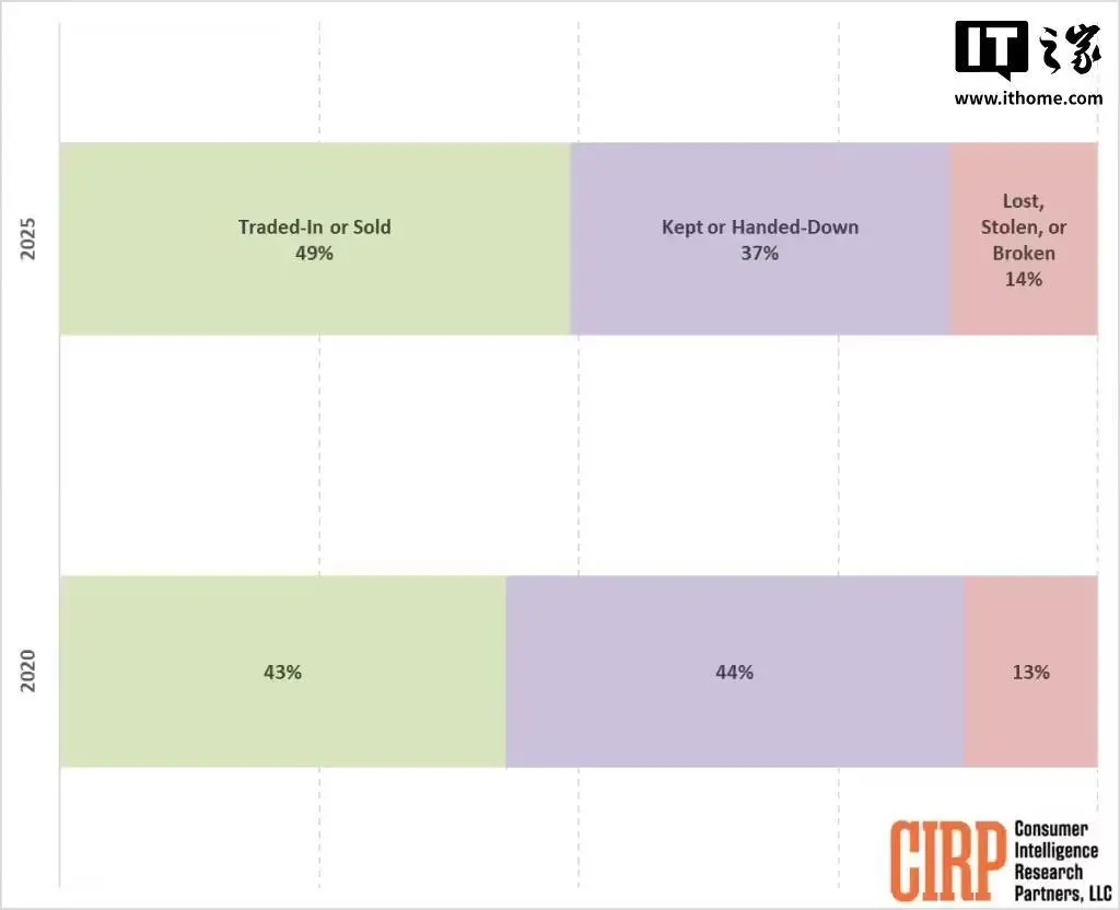 6 月 26 日消息,根據(jù)美國消費(fèi)者情報(bào)研究合作伙伴(CIRP)的最新研究,過去一年中,近半數(shù)(49%)的 iPhone 購買者選擇將他們之前的設(shè)備進(jìn)行以舊換新或出售,這一比例較 2020 年的 43% 有了顯著提升。
