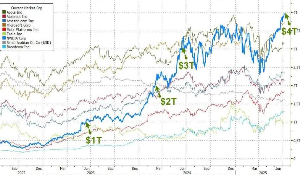 與此同時(shí)華爾街見聞曾提及,英偉達(dá)自身也正經(jīng)歷里程碑式的時(shí)刻。周三英偉達(dá)市值一度站上4萬億美元大關(guān),隨后周四正式成為全球首家市值突破4萬億美元的公司,超越了微軟和蘋果。