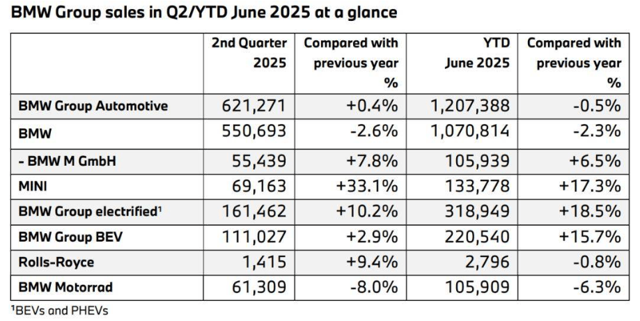寶馬集團官方公布的數據顯示,2025年上半年,寶馬集團電動車版塊全球銷量達31.8949萬輛,同比增長18.5%。
