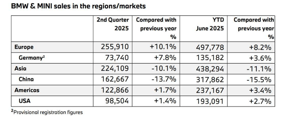 官方數據顯示,2025年上半年,寶馬在歐洲市場、美國市場等均實現了不同程度的銷量上漲態勢。
