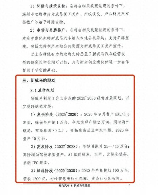 近日,有消息稱一度沉寂的威馬汽車正在籌備復(fù)產(chǎn)。新投資方深圳翔飛汽車銷售公司發(fā)布了一份白皮書,詳細(xì)勾勒出威馬汽車的復(fù)產(chǎn)藍(lán)圖與未來(lái)發(fā)展方向。白皮書中,“新威馬”規(guī)劃了2025—2030年的三步發(fā)展路徑。2025—2026年為復(fù)興階段,計(jì)劃于2025年9月讓EX5和E5車型復(fù)產(chǎn),力爭(zhēng)實(shí)現(xiàn)年產(chǎn)銷1萬(wàn)至2萬(wàn)輛。同時(shí),威馬將著手布局泰國(guó)KD工廠,開拓東南亞及中東市場(chǎng),并將2026年的量產(chǎn)目標(biāo)設(shè)定為10萬(wàn)輛。