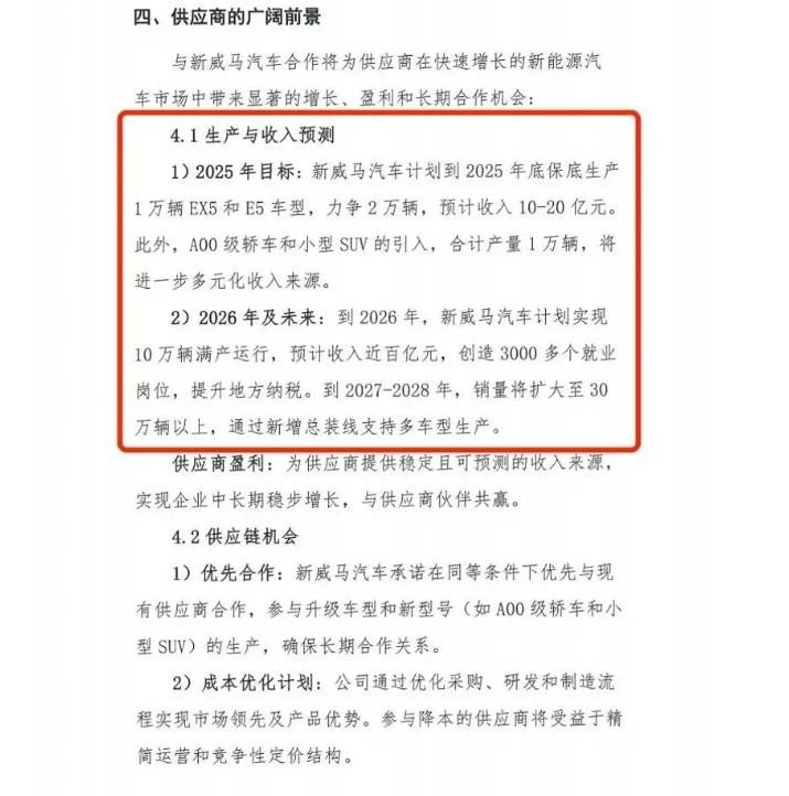 2027—2028年進(jìn)入發(fā)展階段,新威馬的年銷量目標(biāo)將提升至25萬(wàn)到40萬(wàn)輛。期間,威馬將推出具備高階輔助駕駛功能的車型,利用AI技術(shù)優(yōu)化研發(fā)、生產(chǎn)和營(yíng)銷各環(huán)節(jié),并啟動(dòng)IPO的籌備工作。