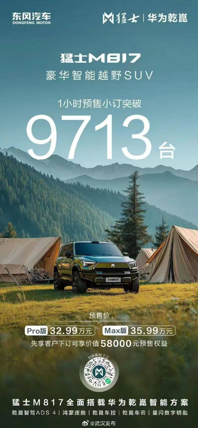 7月17日,東風豪華電動越野品牌猛士第二款產(chǎn)品——猛士M817技術(shù)發(fā)布并開啟預(yù)售。這款整合東風全棧越野技術(shù)積淀與華為智能解決方案的新車,首搭華為乾崑智駕ADS 4.0,預(yù)售1小時小訂達到9713輛;而5天前,行業(yè)首搭華為乾崑智駕ADS4與鴻蒙座艙的嵐圖FREE+正式上市,15分鐘內(nèi)大定鎖單1.15萬輛,成為繼嵐圖夢想家之后,東風高端新能源矩陣的又一標桿。
