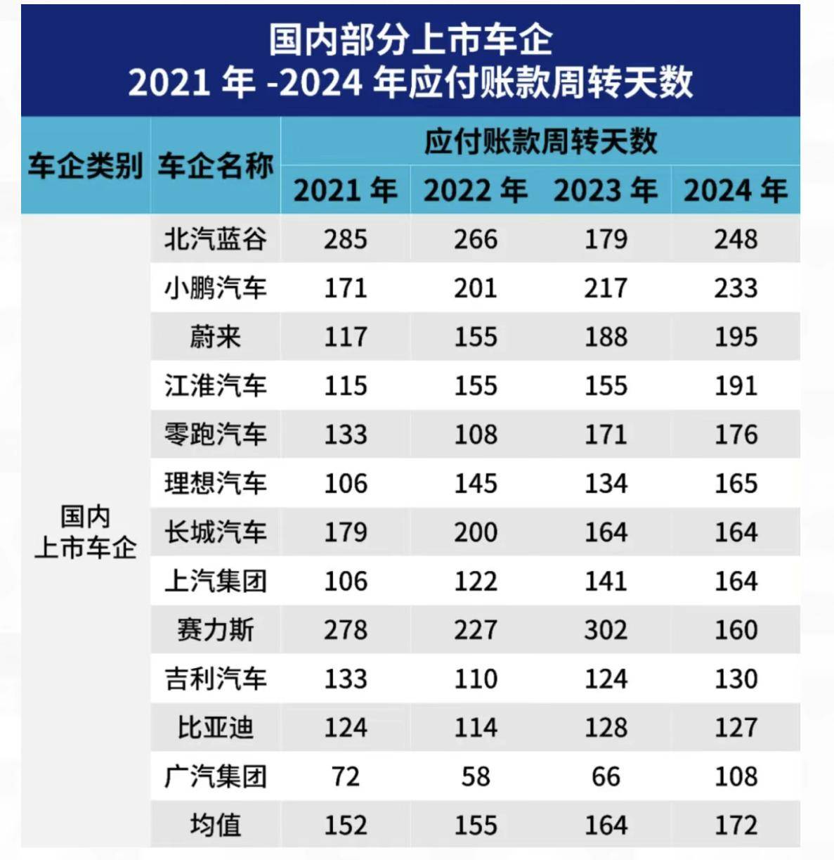 部分汽車經銷商為緩解資金壓力,被迫低價拋售,進一步加劇了虧損。價格戰隱蔽的危害也在持續向供應鏈轉嫁壓力。2024年32家整車企業平均應付賬款周轉天數達109.74天,遠超日系、德系、美系合資車企30-70天的水平。這種超長賬期意味著供應商要等待近四個月才能收到貨款,嚴重影響了現金流和再生產投入。