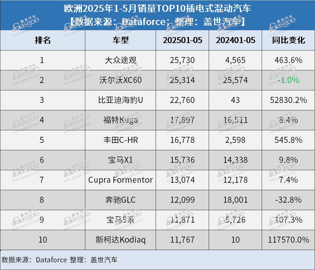 其中,插電式混合動力汽車的銷量同比增長了46%,達到108,497輛。在此之中,中國汽車品牌的插電式混合動力汽車貢獻了13,040輛的銷量,同比暴漲874%,主要由于歐盟對中國純電動汽車加征關稅,迫使中國品牌轉向插電式混合動力汽車和混動汽車。就車型而言,比亞迪的海豹 U以6,492輛的銷量在該細分市場排名第一,其次是大眾途觀和沃爾沃XC60。就前五個月累計銷量來看,比亞迪海豹U則排在第三。