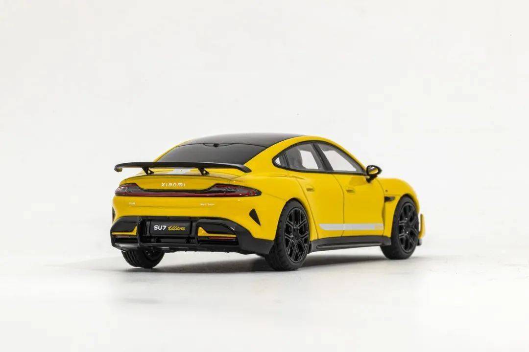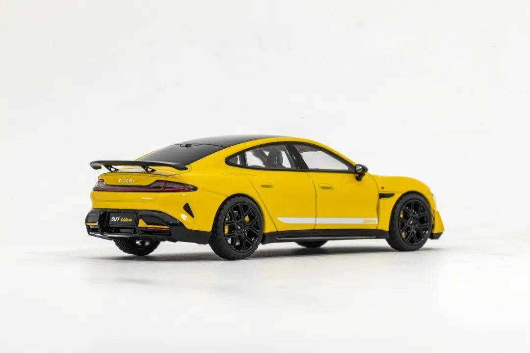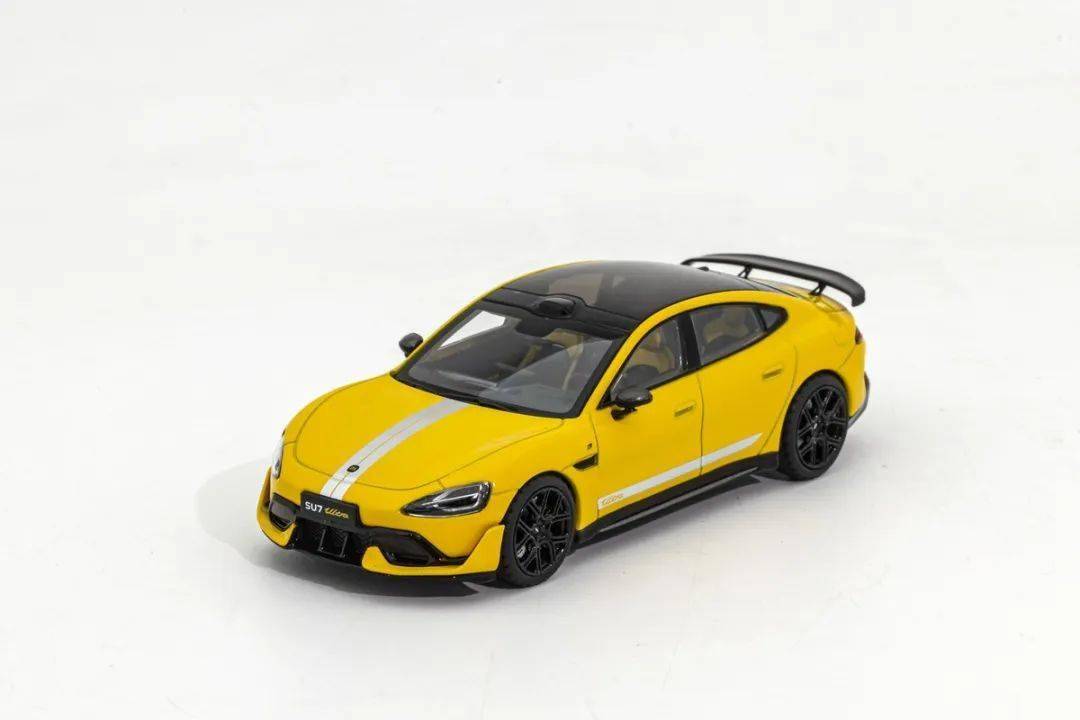 因為這款是小米官方模型,能得到真車外形的原廠數據,因此形準這點上我們是基本不用擔心的;模型的整體比例均衡,縫隙刻線水準還不錯;黃色漆面均勻度也是非常不錯的,模型的車頂為透明天窗(帶可調節玻璃,其實就是深色透明玻璃),車身從前蓋到后蓋中央都有銀色條紋,側面也有印色條紋,還有鏤空出SU7 ULTRA標志;模型的車門把手為浮雕刻畫,車外后視鏡是獨立分件的,而且做了碳纖維;前翼子板后側裝飾塊是浮雕的,但做得還算細膩;車窗邊框浮雕刻畫,黑色分界很清晰,B柱也是浮雕的,有立體感;模型的尾翼也是獨立分件的,尾翼支架應該是金屬材質,比較精細;側包圍是黑色的,貌似是獨立分件,還有一條碳纖維飾條,車頭的側風刀也是鏤空的,后包圍貌似還是獨立分件的。