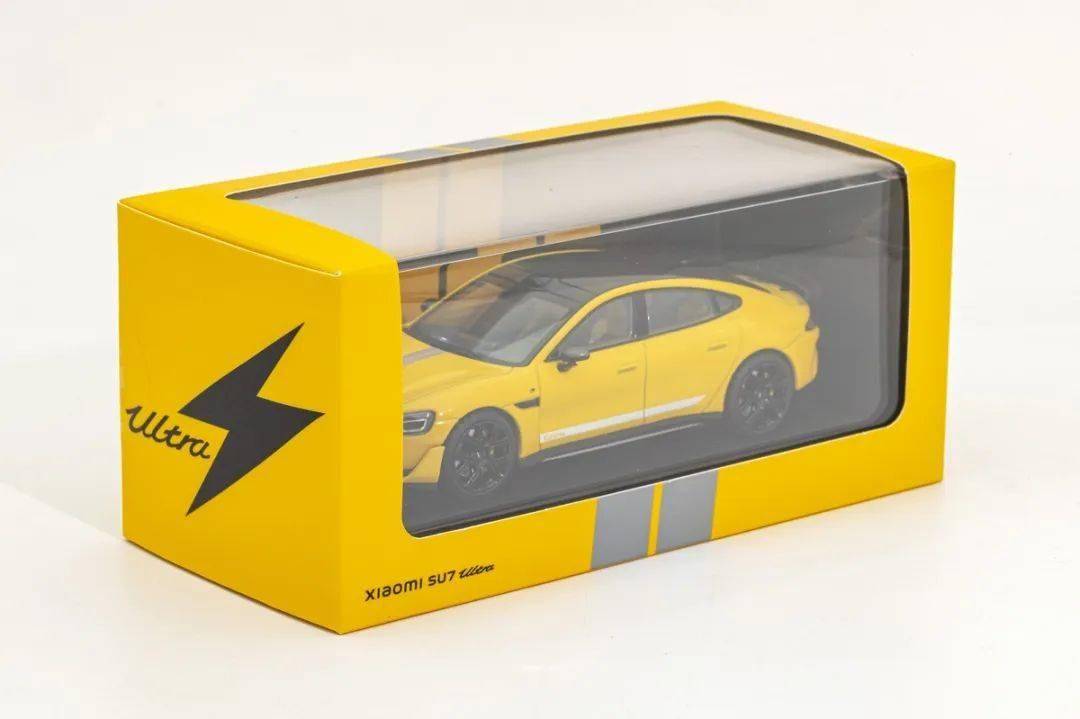 小米的這款SU7 ULTRA模型的包裝采用黃色(車身同色)的開口紙盒,產品配了塑料底座和亞克力罩,包裝外還有牛皮紙盒,這點和保時捷和奧迪的原廠1/43車模很像,看來小米在模型設計上也參考歐洲品牌。